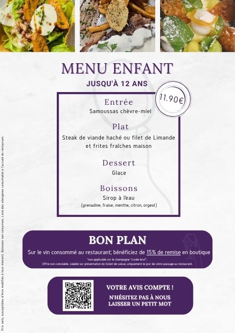 - Menu enfant à 11.90€ (jusqu’à 12 ans)