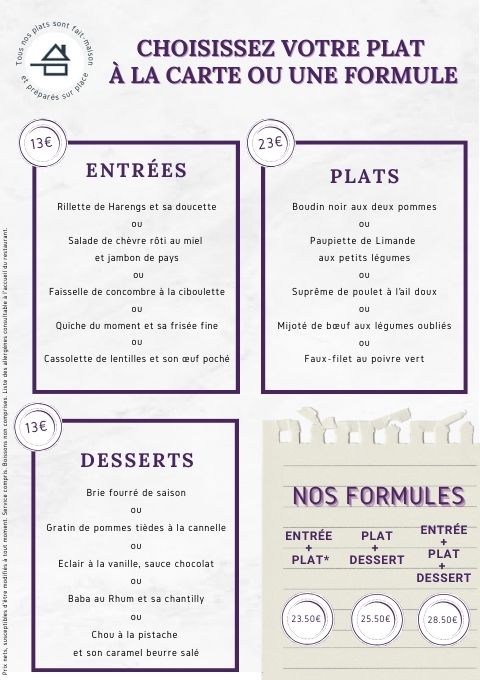 - Plat à la carte ou formules à 23.50€, 25.50€ ou 28.50€